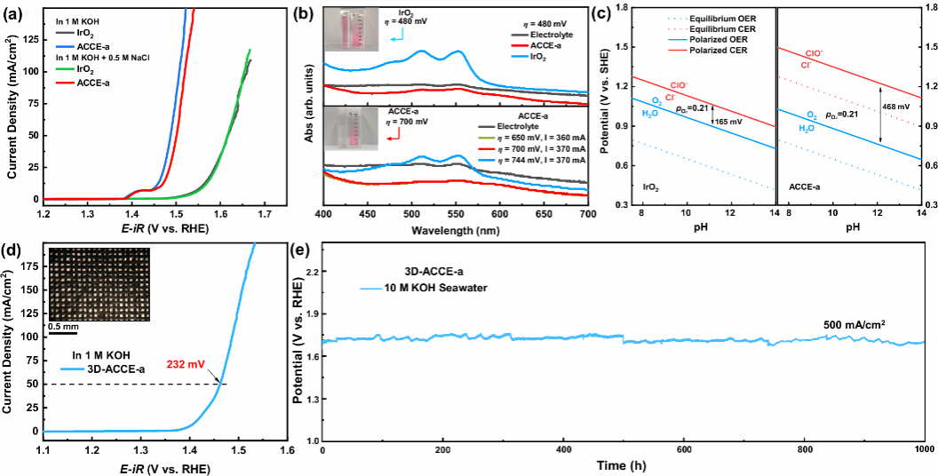 林仕伟/刘一蒲教授团队联合吉林大学邹晓新教授团队在《Nature Communications》发表研究成果,针对海水电解中 Cl⁻引发的析氯竞争反应与电极腐蚀两大核心瓶颈,提出了突破性的基底自适应牺牲腐蚀策略,为高效海水电解阳极制备提供了全新解决方案。该策略通过在不锈钢、碳布、钛网等任意导电基底预沉积 Fe 牺牲层,利用其自发电化学势差诱导 NiFe-LDH 纳米阵列原位生长,既避免基底腐蚀,又突破了传统腐蚀工程对 Fe/Ni 基基底的依赖限制,实现活性相的普适性构筑。经电化学活化后,NiFe-LDH 重构为富氧空位的 NiFeOOH 活性相(ACCE-a),Fe 位点周围优先生成的氧空位通过优化电子结构提升催化活性,结合 Ni 位点对 Cl⁻的弱吸附保护机制,形成双位点协同抑氯效应。实验证实,该电极在 10 mA/cm² 下过电位低至 182 mV,在 10 M KOH 海水体系中 500 mA/cm² 电流密度下可稳定运行 1000 小时,且在沿海高湿环境中存放 3.5 年性能无衰减。更具突破性的是,团队首次建立定量检测方案,证实其析氧专属窗口(OER-only window)达 700 mV,远超商用 IrO₂的 480 mV 热力学极限,从动力学层面突破了传统认知。该成果不仅提出了可规模化的工业级阳极制备新路径,更建立了 OER 选择性的定量评估标准,对推动绿氢产业的海水资源高效利用具有重大理论与应用价值。