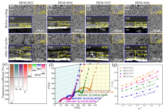 图5. 系列ZnxGeyCuzSiwP2高熵固溶体电极循环前后的SEM形貌及横截面图片(a-d),体积膨胀系数对比(e),电化学阻抗EIS图谱(f)及扩散系数对比(g)。