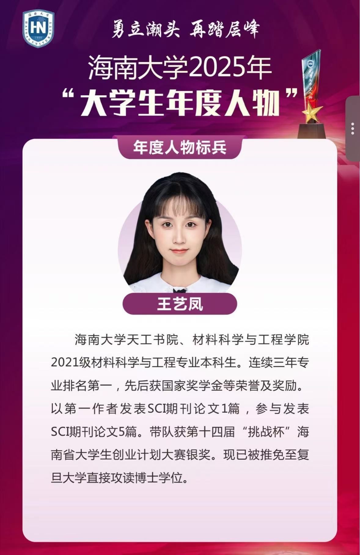 王艺凤,共青团员,海南大学2025年大学生年度人物标兵,澳门银河赌场 2021级材料科学与工程专业本科生,现已推免至复旦大学直接攻读博士学位。学业上,她连续三年综合排名专业第一,核心课程成绩优异,以扎实的专业功底为学术之路筑牢根基。作为班级学委,她主动担当学风建设重任,牵头组织学习分享会、重难点答疑等活动,用责任与热忱赢得师生广泛认可。科研方面,她自大一就加入导师实验室学习,协助师兄师姐钻研材料科学前沿课题。从基础实验操作到方案设计、成果转化,她步步扎实,累计参与完成多项科研任务。以第一作者身份在SCI一区期刊发表论文1篇,参与发表SCI论文5篇,累计影响因子超40,获授权国家专利2项,展现出良好的科研素养与创新能力。实践中,她全面发展、勇于突破,带队斩获第十四届“挑战杯”海南省大学生创业计划大赛银奖,先后荣获国家奖学金等省部级及校级以上荣誉5余项。她以优异的学业成绩、突出的科研能力和全面的综合素质,充分展现了新时代青年勇担使命、追求卓越的精神风貌。
