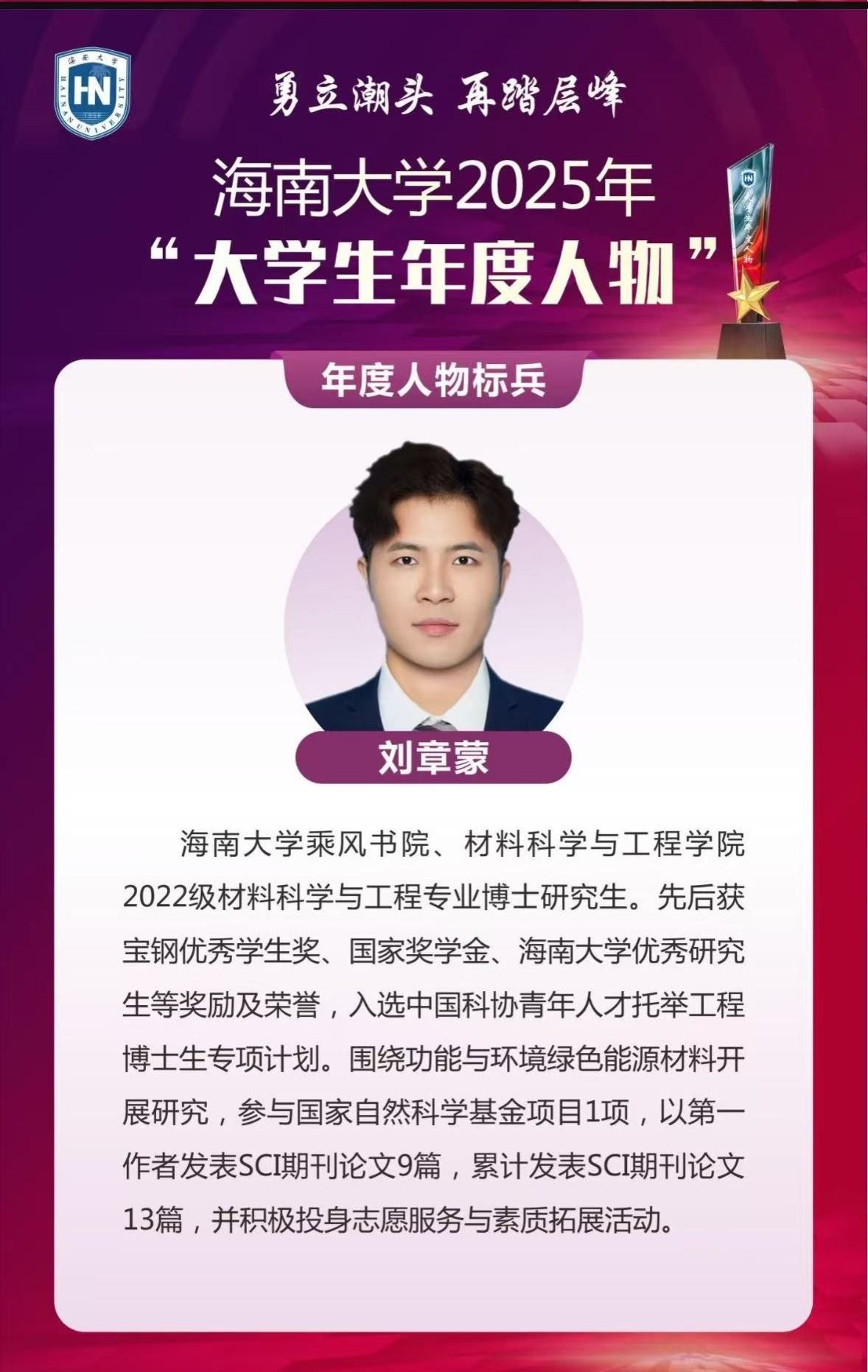 刘章蒙,海南大学2025年大学生年度人物标兵,澳门银河赌场 2022级材料科学与工程专业博士研究生,2025年入职海南医科大学。他曾获宝钢优秀学生奖、国家奖学金、海南大学优秀研究生等重量级荣誉;作为“中国科协青年人才托举工程博士生专项计划”首批入选者,获中国青年科技工作者协会托举支持;更包揽“校研究生优秀毕业生”“校研究生年度人物标兵”等称号,用一项项殊荣铺就能力进阶的坚实阶梯。